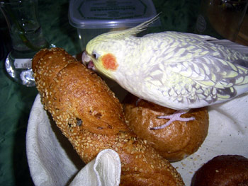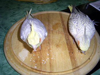 - da musst du mal unser ganzes Duzend erleben wenn hier Freiflug ist - schon mal 12 Nymphen und eine Reiswaffel erlebt - ist wie Fussball - alles jagt dem einen Reiswaffel ( natuerlich ohne Salz und Zucker) nach.